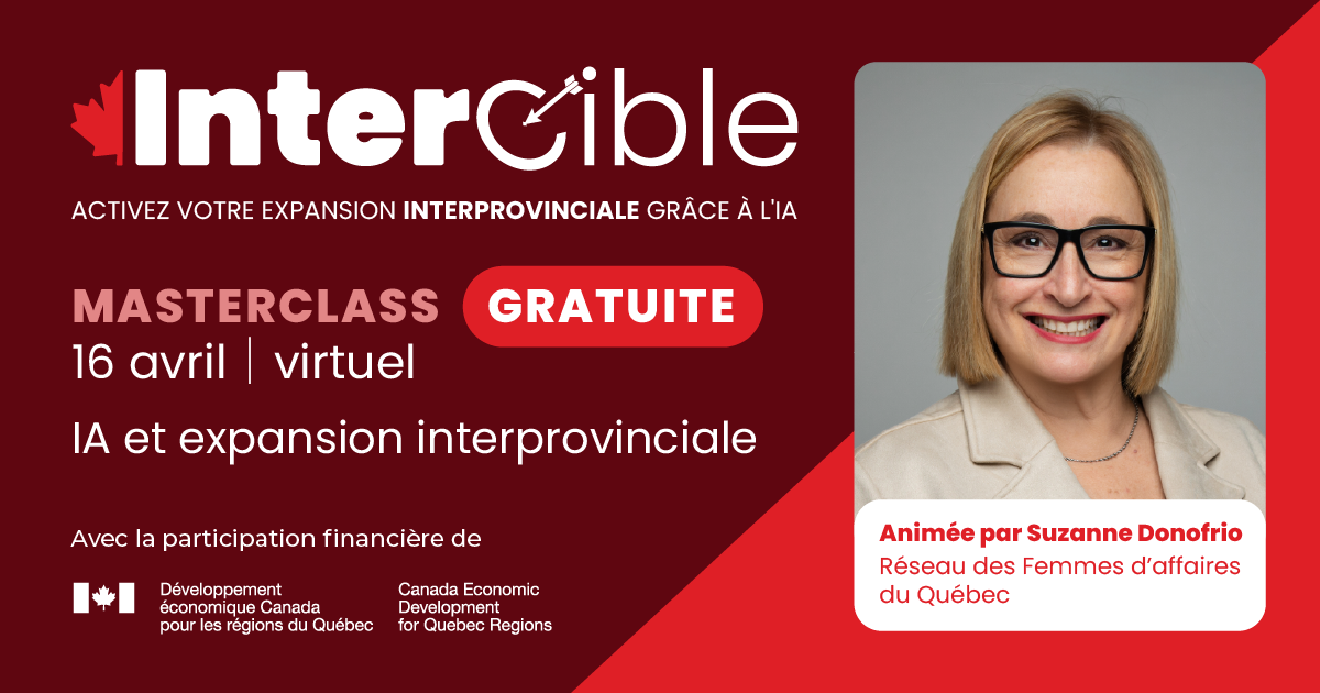 Participez à la prochaine Masterclass InterCible : une séance stratégique gratuite et virtuelle qui vous permettra de découvrir comment l’intelligence artificielle peut devenir un véritable levier de croissance interprovinciale grâce au programme InterCible : un parcours de formation conçu pour accompagner les femmes entrepreneures dans le déploiement et la structuration de leur offre hors Québec.